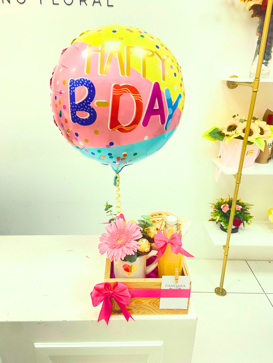 • Waffles • Jugo de naranja • Semillas mixtas • Gomitas • Chocolates mix • 3 chocolates ferrero rocher • Taza • Gerbera con eucalipto • Listón decorativo • Carta • Globo metálico con helio • Todo en una canasta de madera