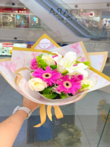 Hermoso ramo de tres rosas fucsia, tres rosas blancas, dos gerberas fucsia, un lirio y Campanas de Irlanda