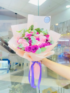 Ramo de rosas moradas, pompón morado, clavel fucsia y eucalipto.