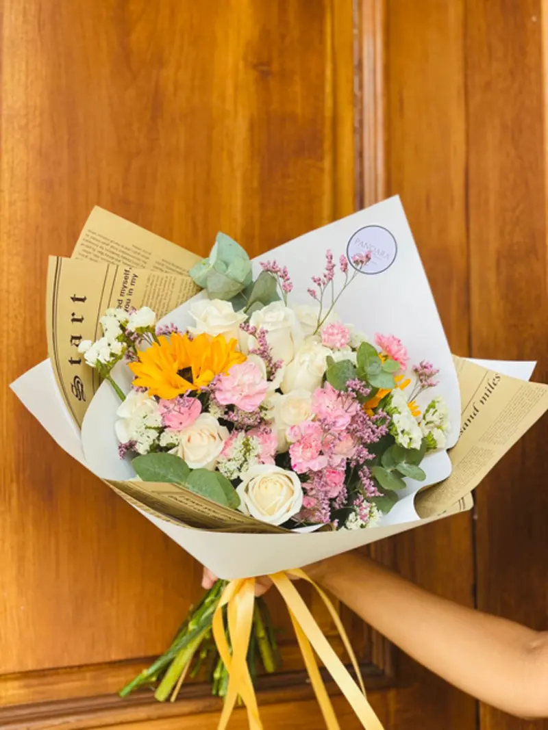 Ramo con rosas blancas, girasoles, limonium, estaticia, claveles y eucalipto.