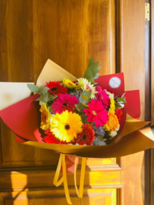 Ramo con gerberas mixtas, hortensias azules, claveles y eucalipto.