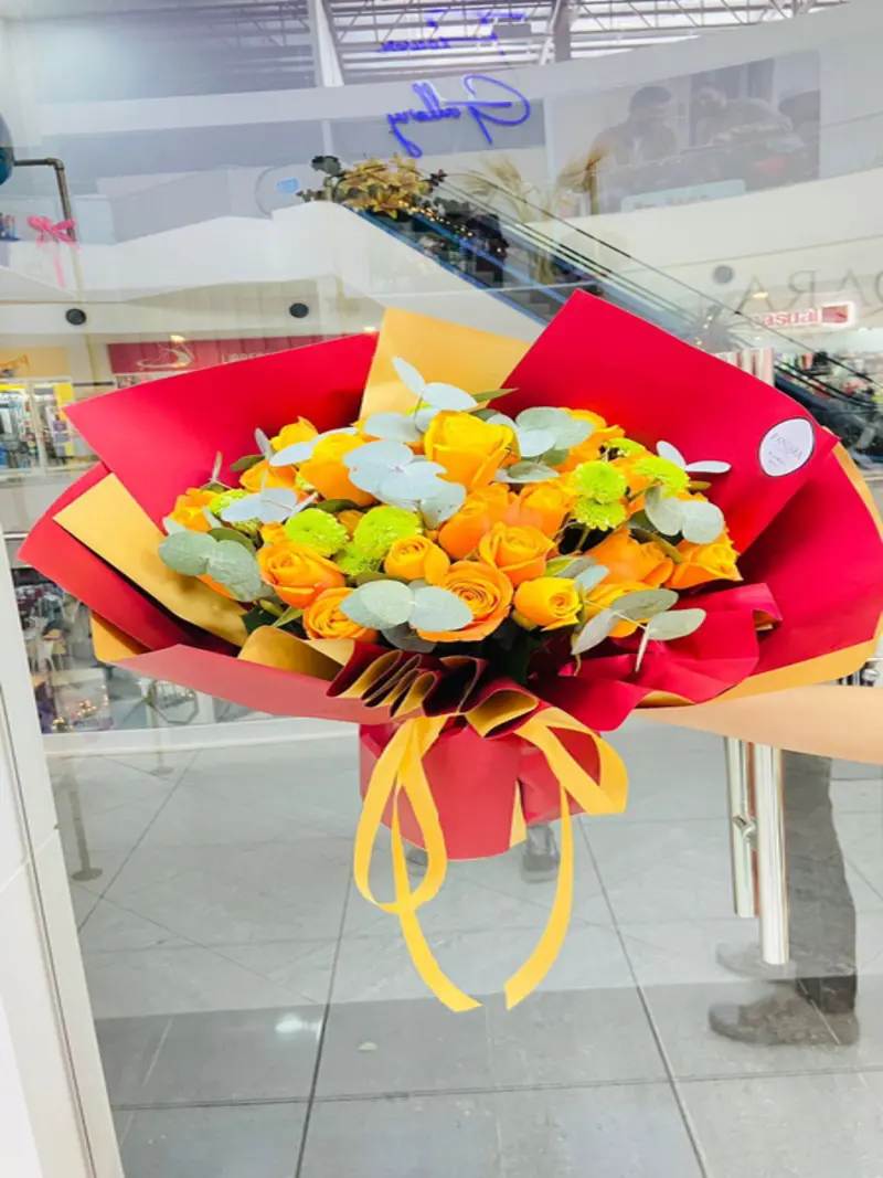 Ramo con 30 rosas anaranjadas, pinocho y eucalipto.
