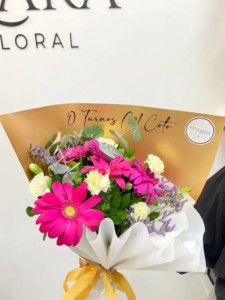 Ramo con gerberas, rosas y eucalipto. Texto personalizable