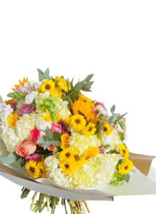 •Ramo con rosas, hortensias, dragón, eucalipto, margaritas y girasoles.