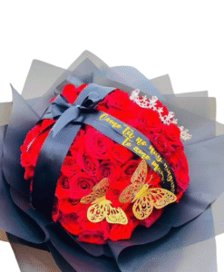 •Ramo gigante de 100 rosas rojas con •corona grande de reina, mariposas y cinta •personalizada.